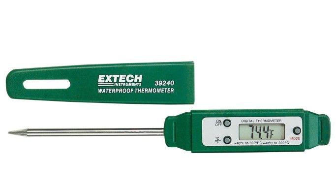 Termómetro de vástago impermeable marca EXTECH. Este termómetro de vástago es de bolsillo con una pantalla digital con resolución de 0.1 ° y grabación mínima / máxima. Mide la temperatura en sólidos y líquidos congelados utilizando el vástago de acero inoxidable de 2.75 in (70 mm).